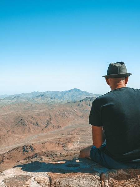 Ein Mann mit Hut sitzt auf einem Berg und schaut hinunter ins Tal und zu anderen Bergen.