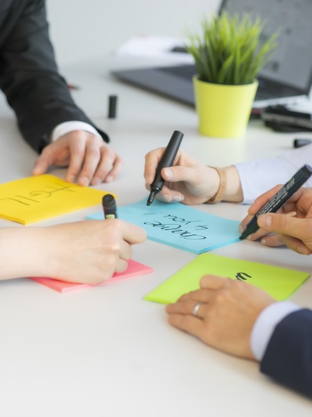 Mehrere Personen sitzen an einem Tisch und schreiben gemeinsam mit Stiften auf bunten Notizzetteln.